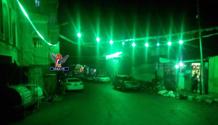 فيما تعتلي الأعلام الخضراء والبيضاء واللوحات الضوئية، أسطح منازل المواطنين والمحال التجارية تأكيداً على عظمة المناسبة لدى أبناء المحافظة ومدى ارتباطهم بالرسول الأكرم.