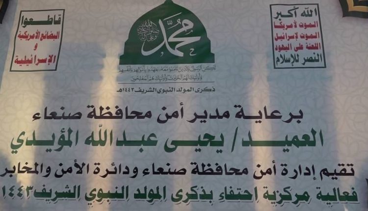 وفي الفعالية بحضور عدد من وكلاء محافظة صنعاء والقيادات الأمنية بالمحافظة، أكد العميد يحيى المؤيدي ان مناسبة المولد النبوي الشريف محطة للتزود من القيم والمبادئ والصفات الحسنة للنبي الأعظم محمد صلوات الله عليه وآله..