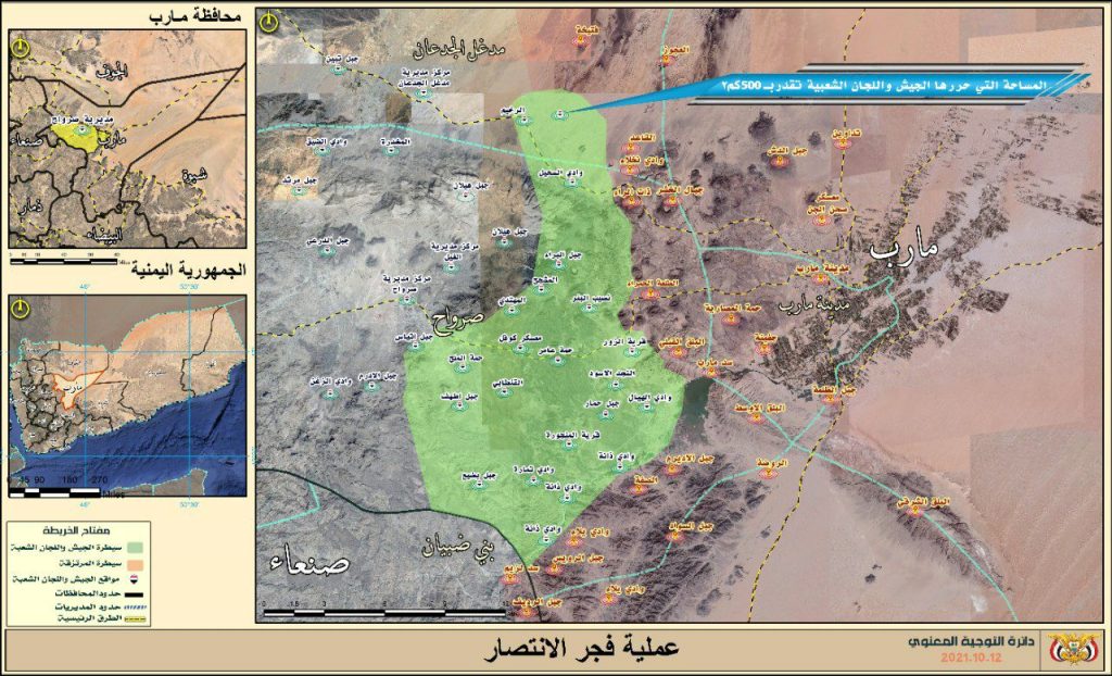 وأشار العميد سريع، إلى أنه وبعد النجاح الكبير الذي حققته عملية “البأس الشديد” في تحرير عدد من المديريات بمساحة إجمالية تقدر بـ 1600 كم مربع، دشنت القوات المسلحة عملية “فجر الإنتصار” والتي استهدفت تحرير مناطق أخرى في محافظة مأرب ودحر الغزاة وأذنابهم من الخونة والعملاء والمرتزقة.