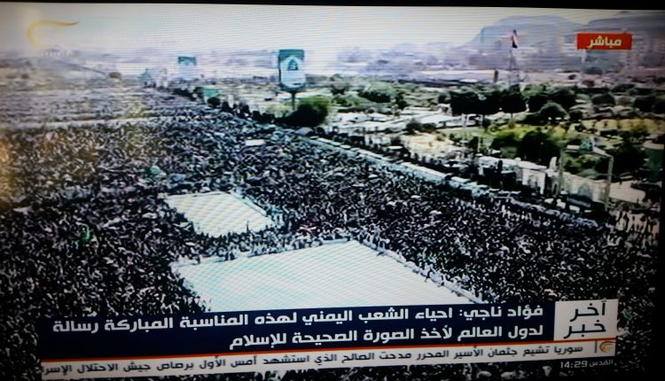 وتتوافد منذ صباح اليوم الإثنين، الحشود الجماهيرية بالعاصمة صنعاء ، إلى ميدان السبعين  للمشاركة في إحياء الفعالية المركزية ابتهاجا بذكرى المولد النبوي الشريف.