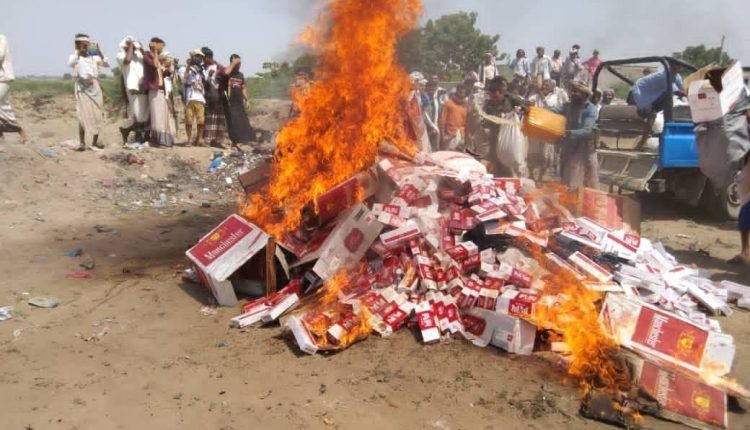 أتلفت النيابة العامة بالتنسيق مع الجهات المختصة بمديرية الدريهمي محافظة الحديدة اليوم الاربعاء 37 كرتونا من السجائر المهربة و67 كرتونا من التفاح و75 كيس مواد لصناعة البلاستيك وكميات من الزيوت المنتهية الصلاحية.