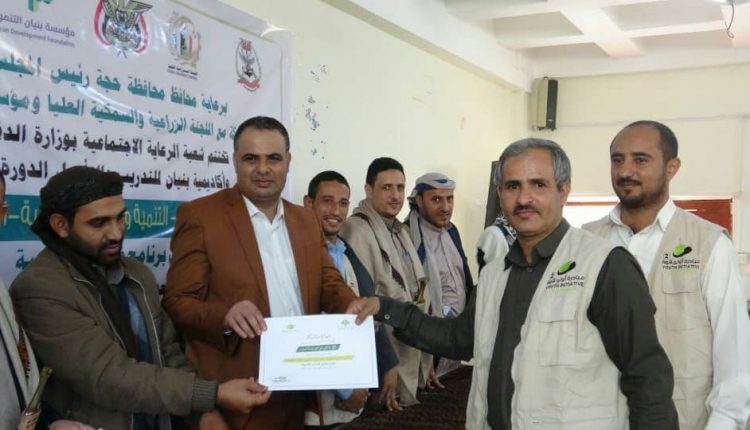 اختتمت بمحافظة حجة دورة تدريبية ضمن برنامج فرسان التنمية، نظمتها أكاديمية بنيان للتدريب والتأهيل بالشراكة مع المجلس المحلي بالمحافظة واللجنة الزراعية السمكية العليا وشعبة الرعاية الاجتماعية.