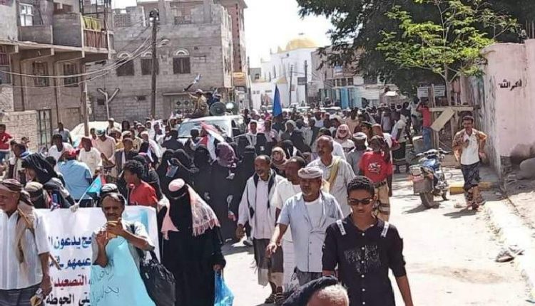 ودعا المحتجون إلى الإلتحام بمظاهرات عدن وإغلاق قصر معاشيق ومقر قوات تحالف العدوان ومطار عدن