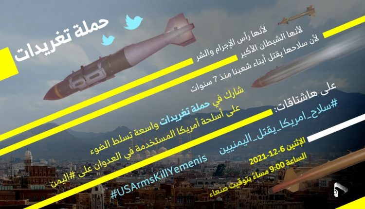تنطلق الساعة التاسعة من مساء اليوم في العاصمة صنعاء وبقية المحافظات الأخرى.. حملة التغريدات الواسعة لتسليط الضوء على أسلحة أمريكا المستخدمة في العدوان على #اليمن