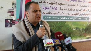 وفي اللقاء بحضور وزير الشئون الاجتماعية والعمل عبيد بن ضبيع اكد محافظ حجة هلال الصوفي اهمية إحياء الذكرى السنوية للشهيد للتعبير عن عظمة المناسبة والشهداء وتضحياتهم دفاعاً عن الدين والعرض والسيادة الوطنية.