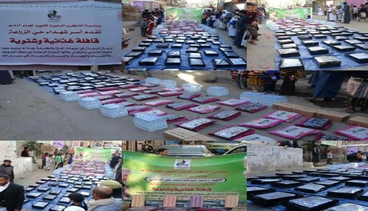 أسر الشهداء بحي الزراعة بأمانة العاصمة يسيرون قافلة غذائية وملابس شتوية دعماً للمرابطين في الجبهات