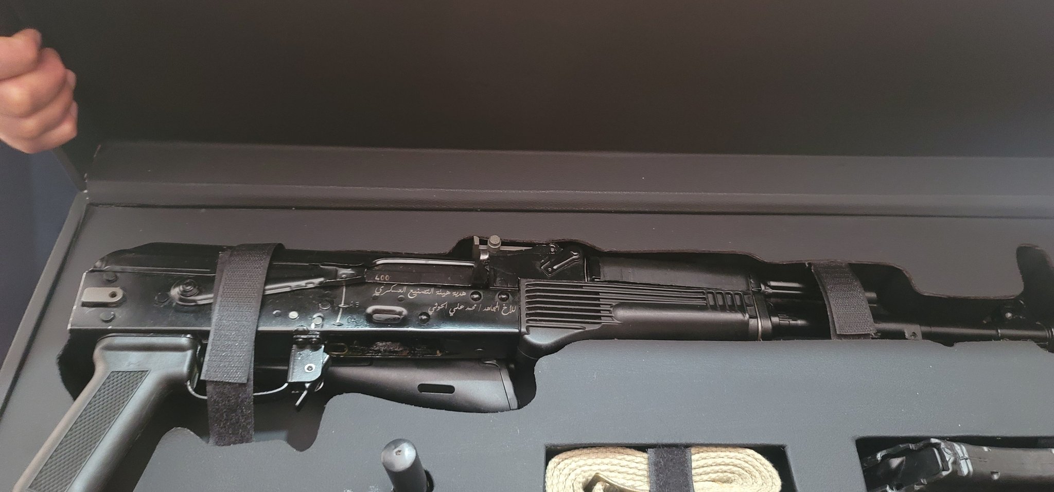 وللمرة الأولى يظهر هذا السلاح للعلن بيد محمد علي الحوثي بعد ان جاءه هديه من التصنيع الحربي اليمني.