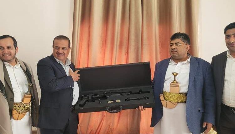 تسلم عضو المجلس السياسي الأعلى محمد علي الحوثي، اليوم الإثنين، سلاح ناري صناعة يمنية 100% جاءه هدية من التصنيع الحربي اليمني.
