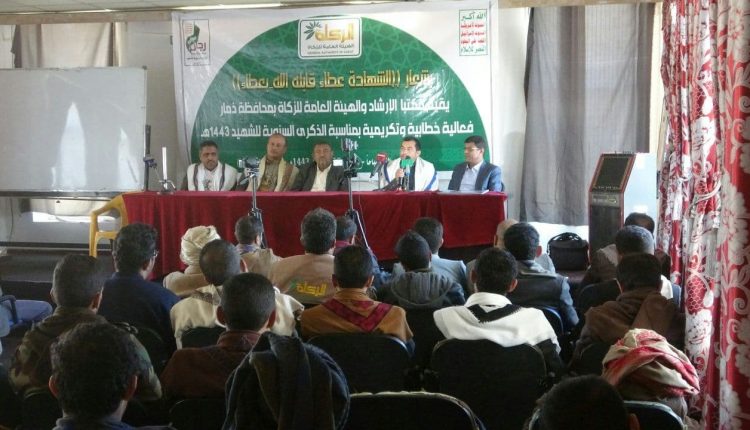 نظم مكتبي الإرشاد وهيئة الزكاة بمحافظة ذمار اليوم فعالية خطابية وتكريمية لأسر الشهداء في إطار فعاليات الذكرى السنوية للشهيد تحت شعار “الشهادة عطاء قابله الله بعطاء”