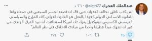 واضاف العجري في تغريدة له اليوم على تويتر: “كان المؤرخ والسياسي الفرنسي الكسيس دوتوكفيل يقول :ان امريكا استطاعت ان تبيد العرق الهندي من غير ان تنتهك مبدأ عظيما واحدا من مبادئ الاخلاق في نظر العالم”.