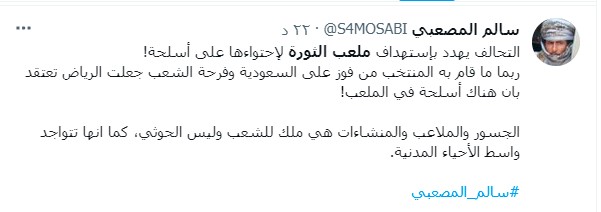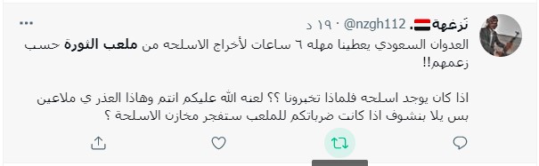 وجاء في خبر تناقلته وسائل التواصل الاجتماعي لحسابات رسمية سعودية إلى إعطائه مهلة لـ 6 ساعات لما أسماه إخراج الأسلحة من الملعب.