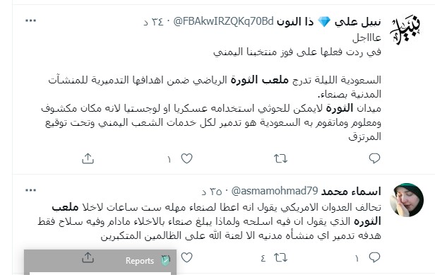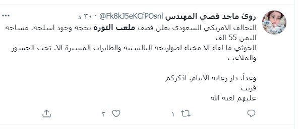 واضاف ناشطون لو كان ملعب الثورة الرياضي يوجد بداخله اسلحة كما يزعم تحالف العدوان لكان قد استهدفه قبل ان يعطي انذاره هذا، حيث قد استهداف احياء اخرى مكتظة بالسكان دون أي تحذير مسبق، ما يؤكد فبركات العدوان ومحاولة الظهور بمظهر التنصل عن جرائمه المتواصلة بحق أبناء الشعب اليمني.