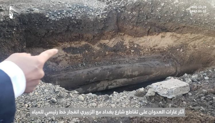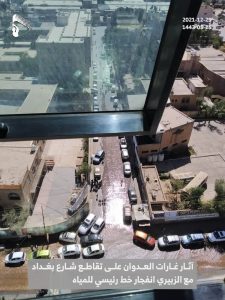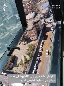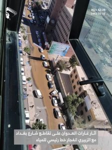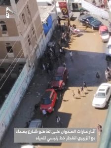 شاهد آثار غارات طيران تحالف العدوان الأمريكي السعودي على تقاطع شارع بغداد مع الزبيري بأمانة العاصمة وانفجار خط رئيسي للمياه .. صور