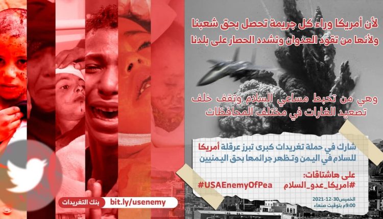شارك في حملة تغريدات كبرى من صنعاء والمحافظات اليمنية بمشاركة أحرار العالم لإبراز عرقلة أمريكا للسلام في اليمن وتظهر جرائمها بحق اليمنيين