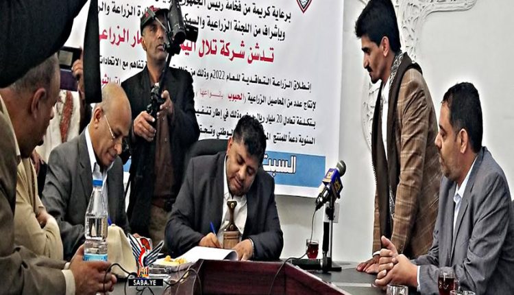 أشرف عضو المجلس السياسي الأعلى محمد علي الحوثي اليوم على توقيع مذكرة تفاهم بين الاتحاد التعاوني الزراعي والاتحاد التعاوني لجمعيات منتجي الحبوب وشركة تلال اليمن للاستثمار الزراعي، لتنفيذ المرحلة الأولى من مشروع الزراعة التعاقدية بتكلفة 20 مليار ريال.
