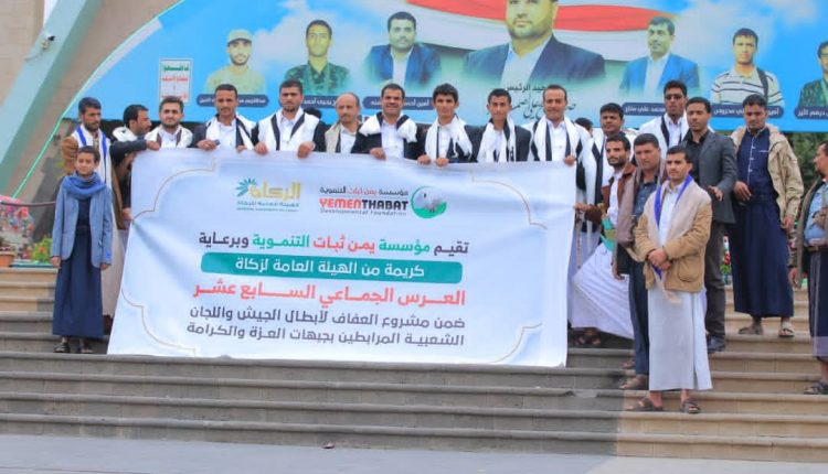 نظمت مؤسسة يمن ثبات التنموية بأمانة العاصمة، اليوم العرس الجماعي السابع عشر لـ ١٣ من المرابطين في الجبهات، بدعم من الهيئة العامة للزكاة ضمن مشروع العفاف.