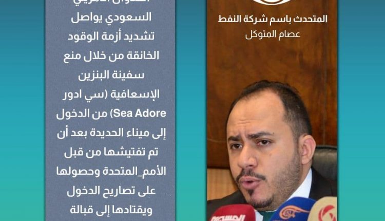 وقال المتحدث الرسمي لشركة النفط اليمنية عصام المتوكل إلى أن العدوان الأمريكي السعودي منع سفينة البنزين الإسعافية (سي ادور Sea Adore) من الدخول إلى ميناء الحديدة بعد أن تم تفتيشها من قبل الأمم المتحدة وحصولها على تصاريح الدخول..