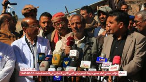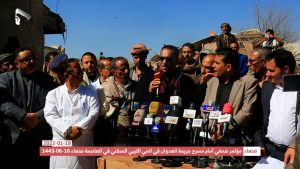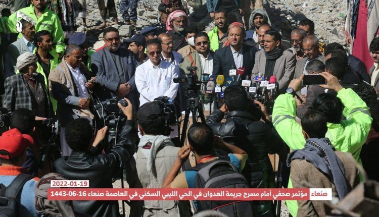 بحضور مختلف وسائل الاعلام، عقد في الحي الليبي السكني بالعاصمة صنعاء اليوم الأربعاء مؤتمراً صحفياً على خلفية استهداف طيران تحلف العدوان لهذا الحي المكتظ بالسكان، ما اسفر عن 14 شهيداً بينهم نساء واطفال و 12 جريح، فيما تزال بقية الجثث تحت الانقاض.