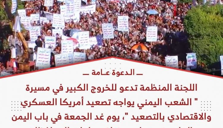 وحددت اللجنة في صنعاء ساحة باب اليمن مكانا لمسيرة “الشعب اليمني يواجه تصعيد أمريكا العسكري والاقتصادي بالتصعيد” عصر الجمعة.