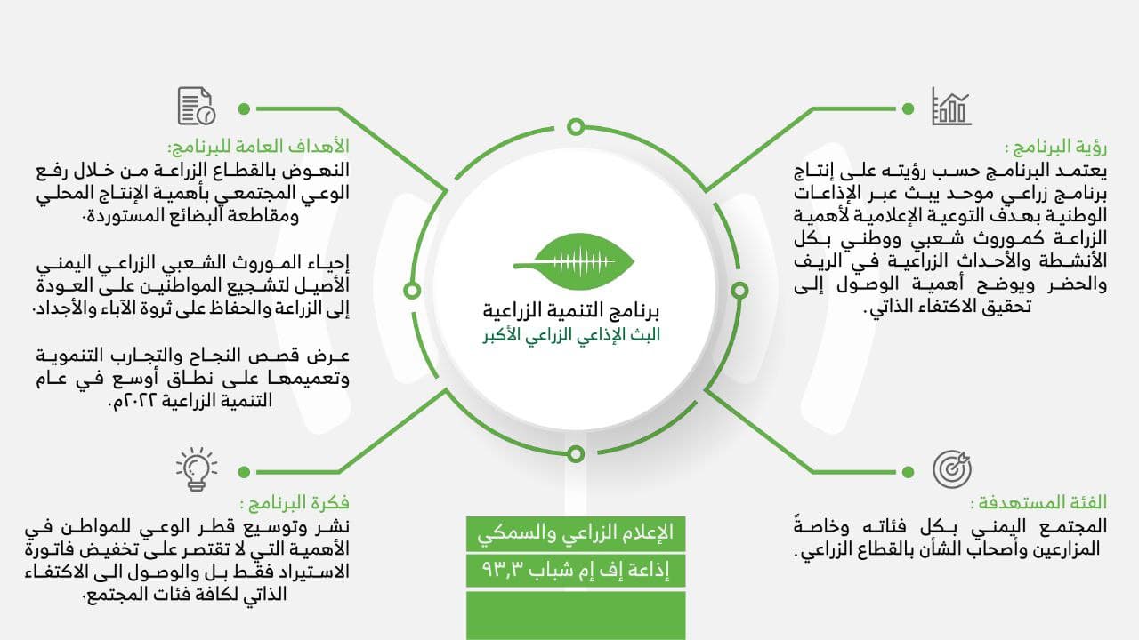 ووفقا الإعلام الزراعي والسمكي فإن البرنامج يهدف إلى توحيد الصوت الإذاعي، وتسليط الضوء على القطاع الزراعي وتنميته وفق موجهات قائد الثورة السيد عبدالملك الحوثي، ونشر الثقافة الزراعية القرآنية، وإحياء الموروث الشعبي الزراعي، وايصال الإرشادات الزراعية إلى المزارعين.