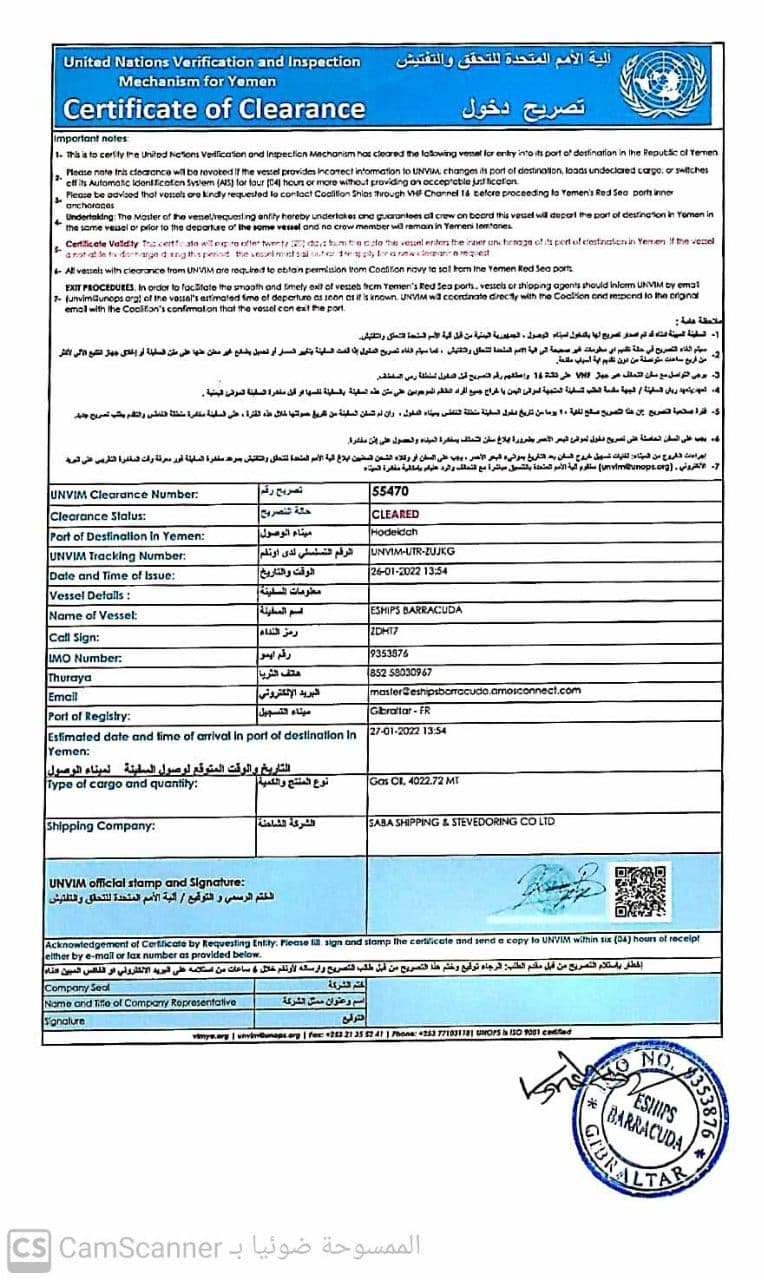 وأشار إلى أن قوى العدوان قامت باقتياد هذه السفينة قسراً إلى قبالة سواحل جيزان رغم حصولها على تصاريح آلية التحقق والتفتيش الأممية.