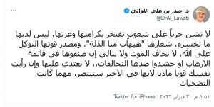وأضاف اللواتي في تغريدة له على “تويتر”: “لا تعتدي عليها وإن رأيت نفسك قويا ماديا لأنها في الأخير ستنتصر مهما كانت التضحيات”، في إشارة منه إلى الشعب اليمني.