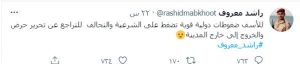 وقال راشد معروف في تغريدته: ” للأسف ضغوطات دولية قوية تضغط على الحكومة والتحالف للتراجع عن ما أسماه تحرير حرض والخروج إلى خارج المدينة”.