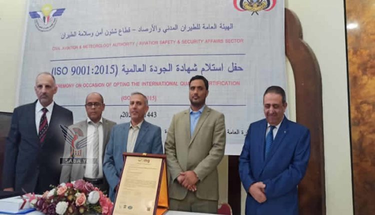 وقال ” إن الحصول على شهادة الايزو العالمية مكسباً كبيراً للجمهورية اليمنية في وجه العدوان الذي يدّعي كذبا وزورا عدم الجاهزية الفنية والتشغيلية في مجال الملاحة الجوية والطيران المدني”.
