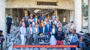 عقدت وزارة الاتصالات وتقنية المعلومات، اليوم الاثنين، مؤتمرا صحفيا على أنقاض مبنى الشركة اليمنية للاتصالات الدولية “تيليمن” المستهدف من قبل طيران العدوان الأمريكي السعودي ليل الأحد/ الاثنين، معلنة انقطاع خدمة الاتصالات الدولية عن اليمن جراء قصف العدوان، فيما نفت “تيليمن” نفيا قاطعة مزاعم العدوان حول استخدام موقع الشركة لأغراض عسكرية.