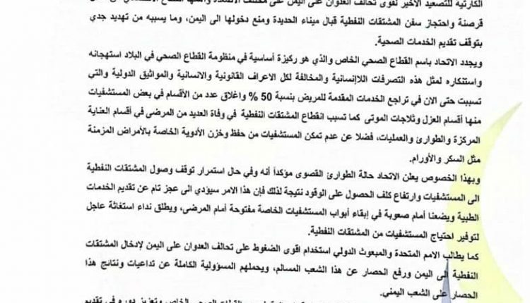 عطفاً على المؤتمر الصحفي الذي نظمه اتحاد المستشفيات اليمنية الخاصة بتاريخ 10 فبراير 2022 لشرح الاثار الكارثية للتصعيد الأخير لقوى تحالف العدوان على اليمن على مختلف الأصعدة وأهمها القطاع الاقتصادي من خلال قرصنة واحتجاز سفن المشتقات النفطية قبال ميناء الحديدة ومنع دخولها الى اليمن، وما يسببه من تهديد جدي بتوقف تقديم الخدمات الصحية.
