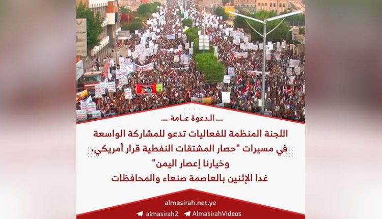 دعت اللجنة المنظمة للفعاليات، للمشاركة الواسعة في مسيرات “حصار المشتقات النفطية قرار أمريكي، وخيارنا إعصار اليمن” في مختلف المحافظات يوم غد الاثنين.
