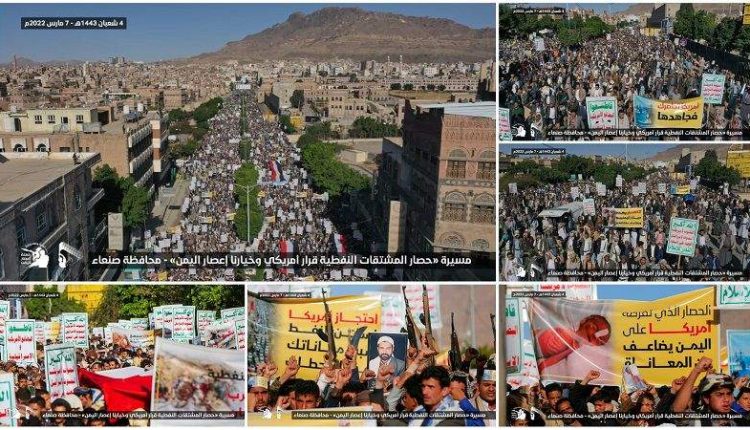 شهدت العاصمة صنعاء، عصر اليوم الاثنين، مسيرة جماهيرية كبرى تحت شعار: (حصار المشتقات النفطية قرار أمريكي، وخيارنا إعصار اليمن).
