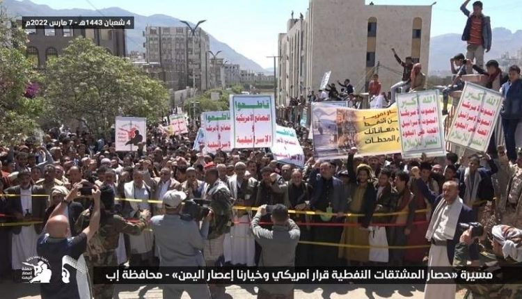 مسيرة حاشدة بمحافظة إب تحمل أمريكا المسؤولية الكاملة إزاء استمرار الحصار واحتجاز سفن الوقود