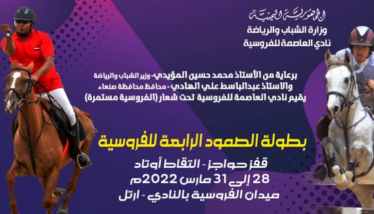 صنعاء تختتم غد الخميس منافسات بطولة الصمود الرابعة للفروسية لقفز الحواجز والتقاط الأوتاد لفئة الفردي