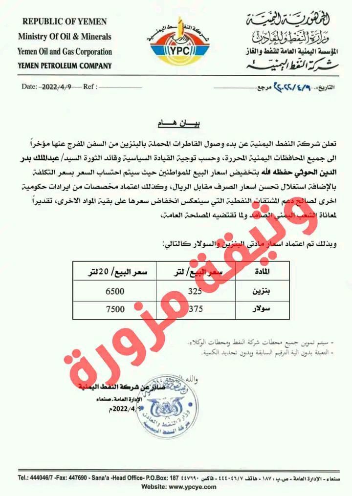 وأرفق المتوكل وثيقة “مزورة جديدة” تداولها نشطاء على مواقع التواصل الاجتماعي على أنها لبيان صادر عن شركة النفط اليمنية في صنعاء حددت فيه أسعار الدبة البنزين سعة 20 لتر بـ 6500 ريال والسولار بـ 7500 ريال، محذّراً من التعاطي معها أو التعامل مع أي مصادر غير رسمية.