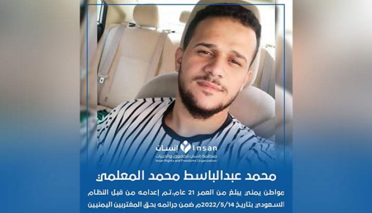 ووفق وكالة “سبأ” أوضح المكتب في بيان أن النظام السعودي اعتقل قبل أربعة أشهر، المواطن محمد عبدالباسط المعلمي من أبناء مديرية عتمة والذي كان يعمل في السعودية منذ العام 2014، وفوجئت أسرته أمس بنبأ إعدامه في وسائل إعلام سعودية.