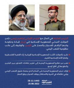 وأشار الرئيس الإيراني إبراهيم رئيسي إلى أن الجمهورية الإسلامية مستعدة لإرسال المساعدات الإنسانية إلى اليمن.