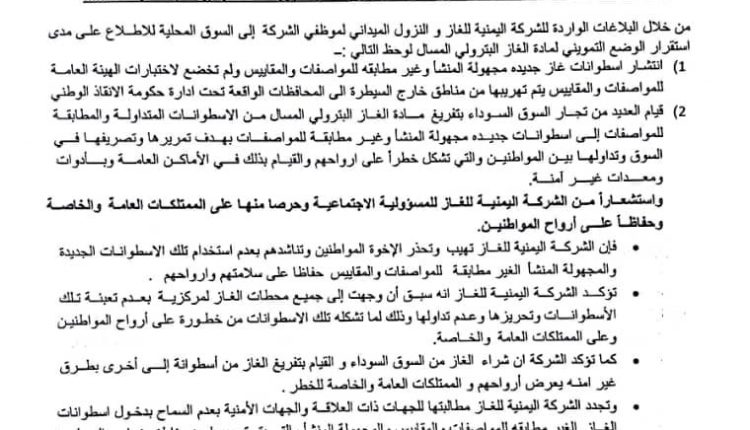 تؤكـــد الشركــة اليمنيــة للغــاز انه سبــق أن وجهت إلى جميـع محطات الغـاز لمركزيــة بعــدم تعبئــة تـلك الأسطوانـــات وتحريزها وعـدم تداولها وذلك لما تشكله تلك الاسطوانات من خطـورة على أرواح المواطنيـن وعلى الممتلكات العامة والخــاصة .