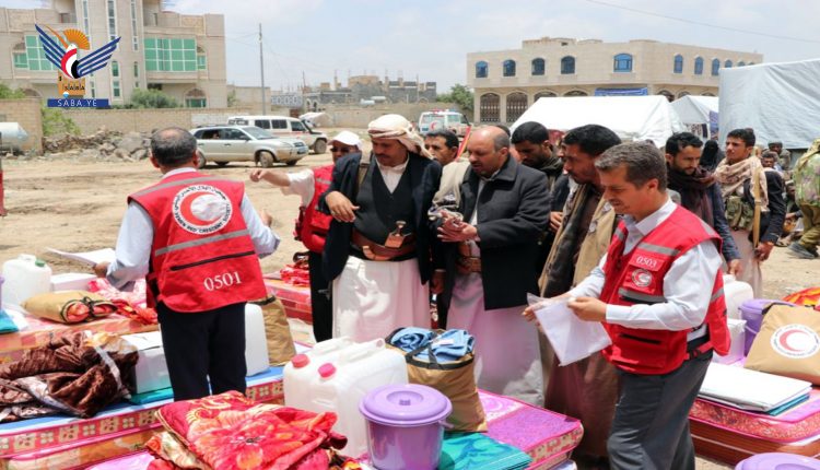الهلال الأحمر يوزع مساعدات للنازحين المتضررين من السيول بمدينة ذمار