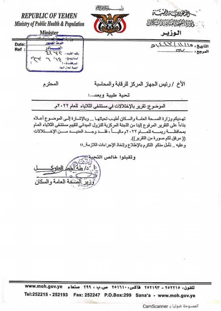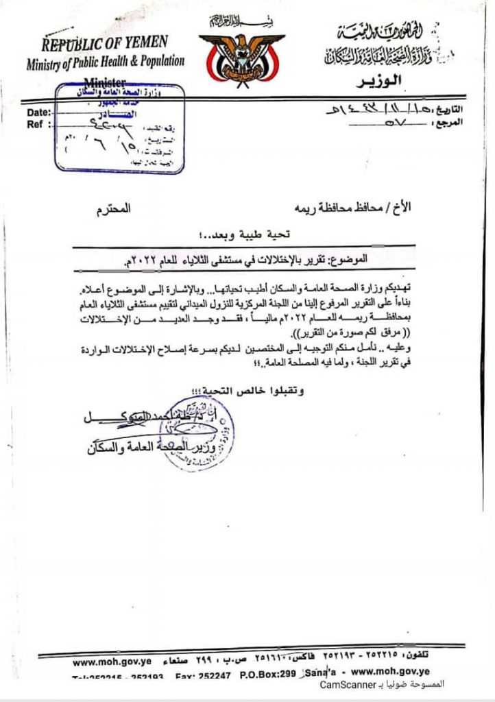 وأشارت إلى أنه على ضوء ذلك أحالت قيادة الوزارة مدير المستشفى إلى الجهاز المركزي للرقابة والمحاسبة بتاريخ الرابع عشر من يونيو من عام 2022م، لاتخاذ الإجراءات القانونية والتحقيق فى قضايا الفساد المنسوب لمدير المستشفى. كما تمت إحالته أيضاً إلى نيابة مديرية الجبين بمحافظة ريمة على ذمة قضايا فساد، والتي كان آخرها ما يتعلق بتهمة التصرف غير المشروع بالدعم المقدم للمستشفى أواخر شهر رمضان الفائت، وتم تزويد محافظ المحافظة بتقرير اللجنة وتلك الاختلالات، مع طلب التوجيه بمعالجتها، غير أن ذلك لم يتم، سواء بسبب غياب المحافظ المتكرر عن المحافظة وعدم تواجده فيها بشكل مستمر، أو لإصراره على تعطيل إجراءات معالجة الوضع الصحي. وتنشر الوزارة الرسائل الموجهة للجهاز المركزي وللأخ محافظ ريمة، تعزيزاً لمعايير المساءلة والشفاقية.