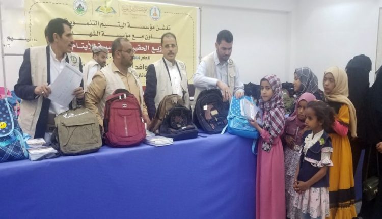 توزيع حقائب ومناهج مدرسية للطلاب الأيتام في الأمانة ومحافظتي البيضاء والحديدة