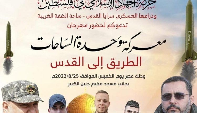 تُنظم حركة الجهاد الإسلامي في فلسطين وجناحها العسكري “سرايا القدس” الخميس مهرجاناً بعنوان “وحدة الساحات … الطريق إلى القدس”، والذي تقيمه الحركة وفاءً لدماء شهداء معركة “وحدة الساحات”، وتأكيدًا على نهج الجهاد والمقاومة.