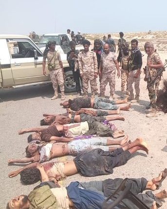 ونشرت وسائل إعلام مرتزقة الإمارات صورة قالوا إنها لجثث قتلى المهاجمين من مليشيا الإصلاح الموالية للسعودية.