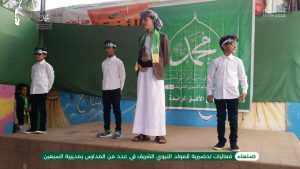 نظم عدد من المدارس الحكومية والأهلية في مديرية السبعين بأمانة العاصمة اليوم، فعاليات خطابية وأنشطة تربوية احتفاءً بذكرى المولد النبوي الشريف على صاحبه وآله أفضل الصلاة والسلام.