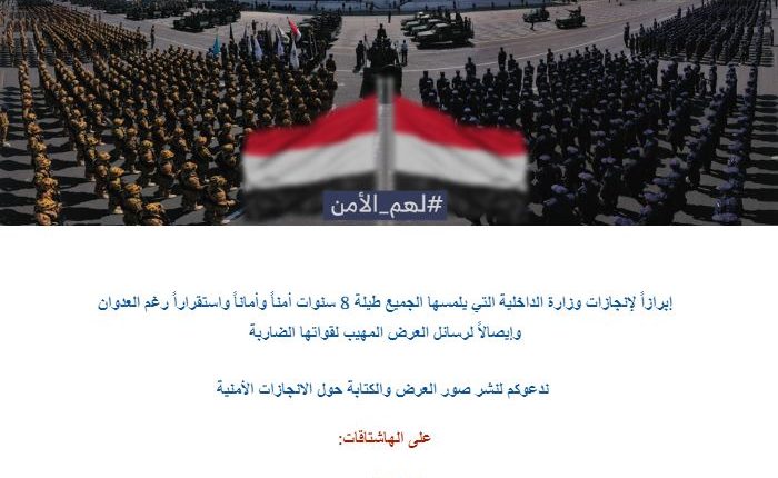 إيصالاً لرسائل العرض العسكري المهيب للوحدات الأمنية بوزارة الداخلية الذي أقيم اليوم الخميس بالعاصمة صنعاء، إلى قوى تحالف العدوان ومرتزقتها أعلنت اللجنة المنظمة لحملة التغريدات الخاصة بـ “إبرازاً لإنجازاتها الأمنية طيلة 8 أعوام من الأمن والأمان رغم العدوان” عن اطلاق حملة تغريدات الساعة التاسعة مساء اليوم، عقب كلمة السيد عبدالملك بدرالدين الحوثي، خلال العرض العسكري للوحدات الأمنية بوزارة الداخلية #لهم_الأمن بالعاصمة #صنعاء.
