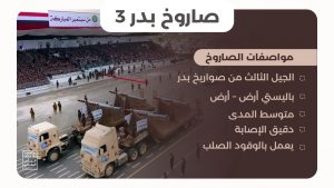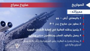 أما الصاروخان “بركان1 وبركان2” بعيدات المدى فقد كانت حاضرة المشهد في العرض العسكري المهيب بميدان السبعين، كما كانا حاضران المعركة وبقوة في معركة الشعب اليمني مع قوى العدوان وكان لهما دور كبير في دك منشآت العدوان في الرياض وفي جدة وفي الدمام، وكذلك صاروخ ذو الفقار بعيد المدى- الذي يعد من المنظومات الصاروخية بعيدة المدى التي استخدمت في قصف أبو ظبي ودبي.
