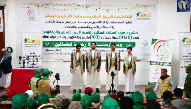 دشنت الهيئة العامة للزكاة بالتنسيق مع مؤسسة أحرار اليمن للرعاية والتأهيل والتنمية لأسر الأسرى والمفقودين والمحررين اليوم، مشروع صرف السلال الغذائية النقدية لأربعة آلاف و120 أسرة بتكلفة 103 ملايين و824 ألف ريال بمناسبة ذكرى المولد النبوي الشريف.