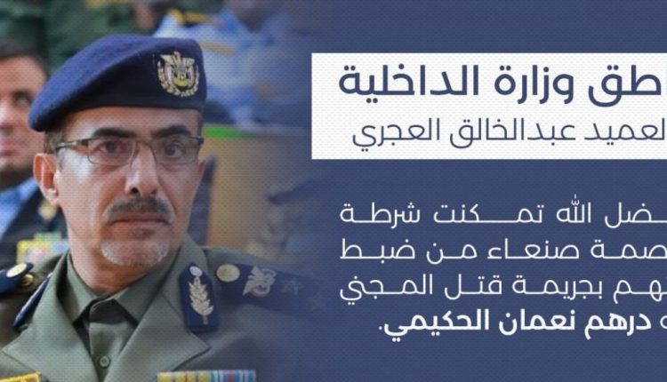 وقال ناطق وزارة الداخلية العميد عبدالخالق العجري في بيان نقله الاعلام الامني عبر وسائل التواصل : بفضل الله تمكنت شرطة العاصمة صنعاء من ضبط المتهم بجريمة قتل المجني عليه درهم نعمان الحكيمي .