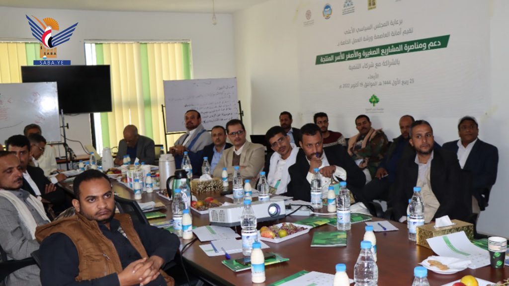 وفي الورشة أكد عضو المجلس السياسي الأعلى محمد النعيمي، أهمية الورشة لمناقشة احتياجات المشاريع الصغيرة والاصغر والصعوبات التي تواجه الأسر المنتجة وكيفية النهوض بهذه المشاريع التي تساهم في تحقيق الاكتفاء الذاتي في مختلف المجالات.
