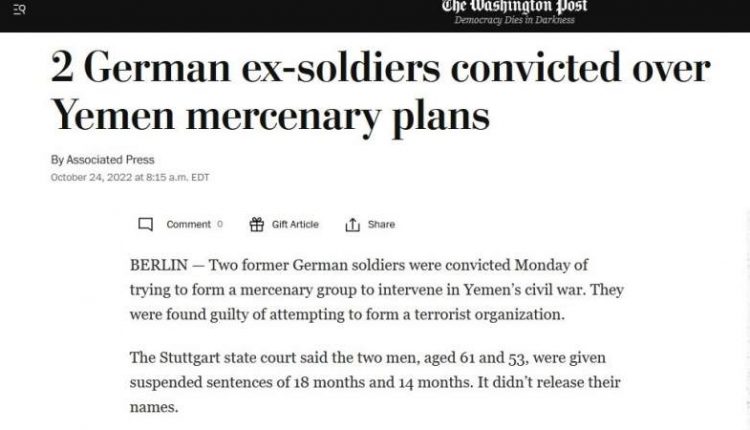أدانت محكمة ألمانية، اليوم الاثنين، جنديين ألمانيين سابقين بمحاولة تشكيل مجموعة مرتزقة للمشاركة في الحرب على اليمن.